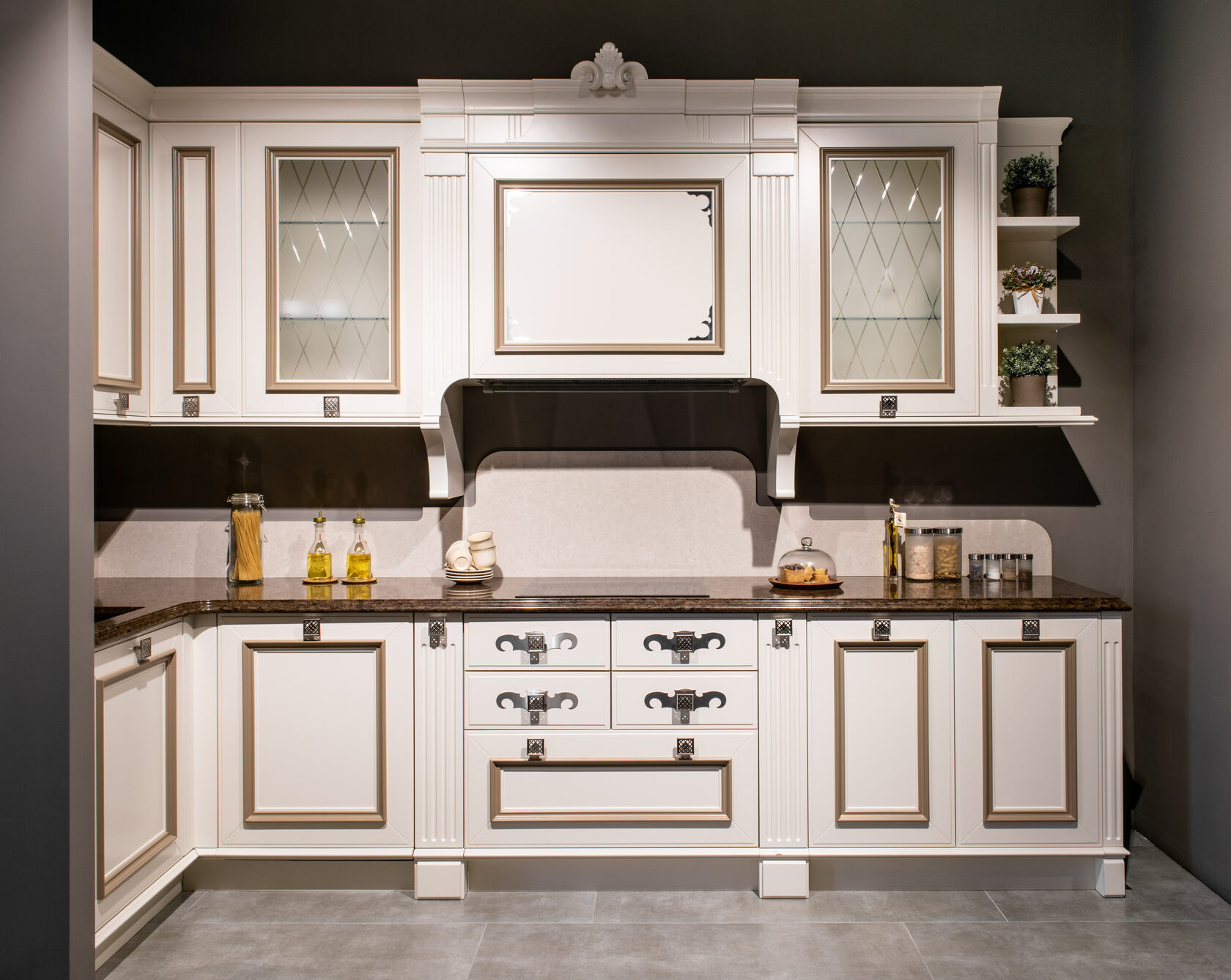 Monticheli – модель, созданная в сотрудничестве с итальянскими дизайнерами, воплощение традиций английского стиля. Акцентная каминная группа, буфет с витринами из стекла stopsol с гравировкой в виде ромба, остров, изящные объемные декоративные элементы – вместе создают неподвластный моде, элегантный и уютный интерьер дома. Лицевые панели гарнитура выполнены из МДФ внушительной толщины–24мм -но, сложная фрезеровка придаёт им воздушный, невесомый вид. Фасадные элементы, окрашенные матовой или полуглянцевой эмалью различных оттенков с возможным нанесением патины золотого, серебряного цветов, способны убедить даже самого придирчивого скептика в том, что перед ним совершенный продукт, создатели которого во главу угла поставили высочайшее качество и безупречный стиль.