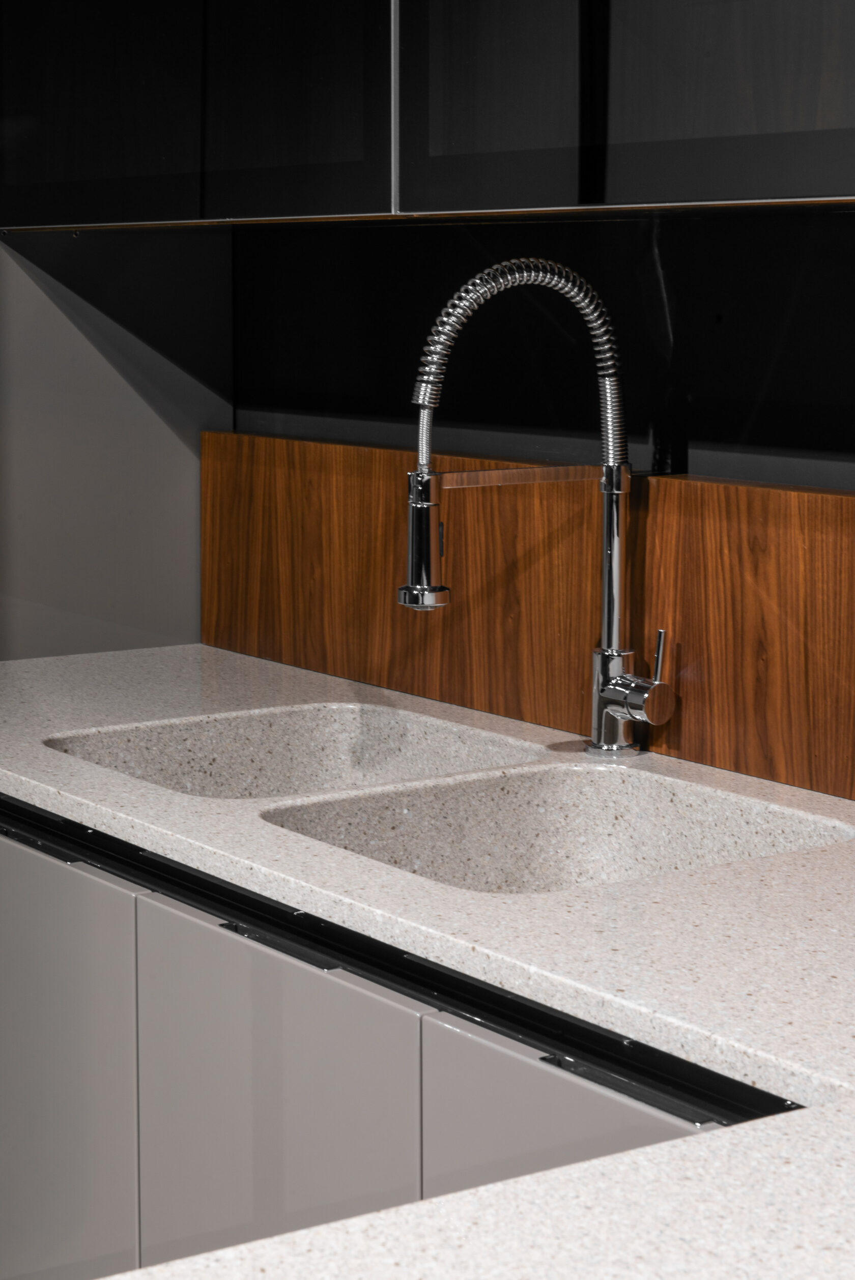 Newport подчеркивает естественность дерева с двумя эксклюзивными отделками – Barrique и Avena, которые покрывают крашеный брашированный дуб, способный украсить самый уютный и эффектный интерьер. Декоративные отделки Bianco Alba, Beige Angora и Grigio Pernice гладкой древесины ясеня с эффектом декапе ассоциируются со скандинавским стилем, могут сочетаться с матовыми лакированными поверхностями и с современными отделочными материалами, создавая интерьер, отличающийся яркой индивидуальностью и теплым очарованием холодного севера. Дерево – благородный материал мебельной традиции, проявляет в модели Newport характерную для современности выразительность. Рамочные фасады, скрывающие врезные ручки, подчеркивают изысканную индивидуальность кухни. Дизайн интерьера предполагает гибкую интерпретацию интернационального стиля, будучи предназначенным для заказчиков в любой стране мира. Newport способна вписаться в любой контекст, будь то традиционный или самый современный городской интерьер, модулируя эстетику композиции посредством чередования материалов и декоративных отделок.